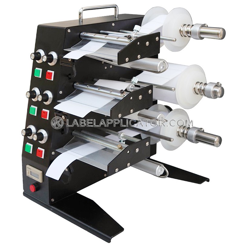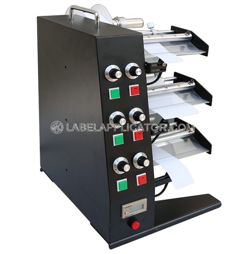 This is a multi-station label dispenser with multiple models to choose from. It supports 2-4 different labels to be mounted at the same time. It integrates multiple label dispensing stations into one machine, which reduces the floor space and is easy to use.